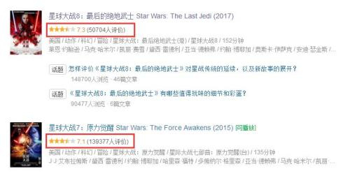 该片目前豆瓣评分为7.3,虽然并非整个系列最低,但也能看出自从迪士尼接手开始“快餐式”拍摄后,口碑下降得十分明显,前三部的评分均在8.3左右,前传虽然声势不如之前,但平均分也在8.0左右。但《星球大战7》直接跌落到了7.1分。