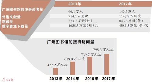 【去年广州图书馆迎客近八百万】广州图书馆一直都是广州市民知识充电的首选去处,馆方昨天公布的一份最新统计数据显示,刚刚过去的2017年,广州图书馆接待访问量持续增长,到访人数达到795.3万人次,平均每天的入馆读者达到2.53万人次(2017年扣除闭馆时间开馆日为314天)。从借阅量来看,2017年的外借文献量达到1142.8万册次,是2013年的1.6倍(2013年外借文献量为714.1万册次),而从馆藏量来看,2017年广州图书馆的馆藏量为843.3万册(件)。