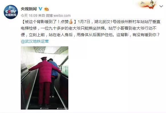 【被这个背影暖到了!点赞】1月7日,湖北武汉1号线徐州新村车站站厅垂直电梯检修,一位九十多岁的老大爷只能乘坐扶梯。站厅小哥看到老大爷行动不便,立刻上前,站在老人身后,用身体从后面护住他。这背影,有没有暖到你?@武汉地铁运营