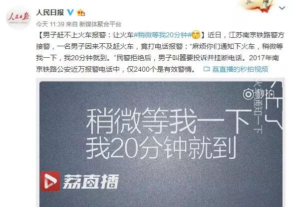 【男子赶不上火车报警:让火车#稍微等我20分钟】近日,江苏南京铁路警方接警,一名男子因来不及赶火车,竟打电话报警:“麻烦你们通知下火车,稍微等我一下,我20分钟就到。”民警拒绝后,男子叫嚣要投诉并挂断电话。2017年南京铁路公安近万报警电话中,仅2400个是有效警情。