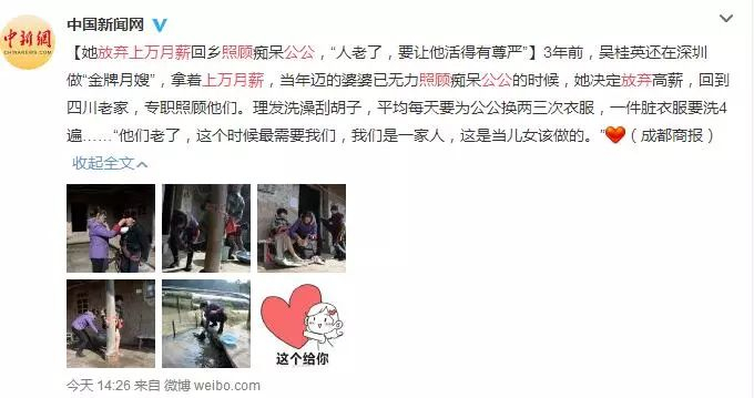 【她放弃上万月薪回乡照顾痴呆公公,“人老了,要让他活得有尊严”】3年前,吴桂英还在深圳做“金牌月嫂”,拿着上万月薪,当年迈的婆婆已无力照顾痴呆公公的时候,她决定放弃高薪,回到四川老家,专职照顾他们。理发洗澡刮胡子,平均每天要为公公换两三次衣服,一件脏衣服要洗4遍……“他们老了,这个时候最需要我们,我们是一家人,这是当儿女该做的。”(成都商报)