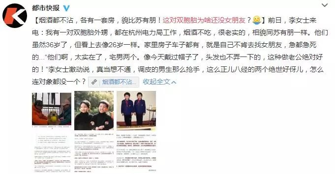 【烟酒都不沾,各有一套房,貌比苏有朋!这对双胞胎为啥还没女朋友?】前日,李女士来电:我有一对双胞胎外甥,都在杭州电力局工作,烟酒不吃,很老实的,相貌同苏有朋一样。他们虽然36岁了,但看上去像26岁一样。家里房子车子都有,就是自己不肯去找女朋友,急都急死的...“他们啊,太实在了,宅男两个。像今天戴过帽子了,头发也不弄一下的,这种做老公绝对好的!”李女士激动说,真当想不通,调皮的男生那么抢手,这么正儿八经的两个绝世好伢儿,怎么连对象都没一个?