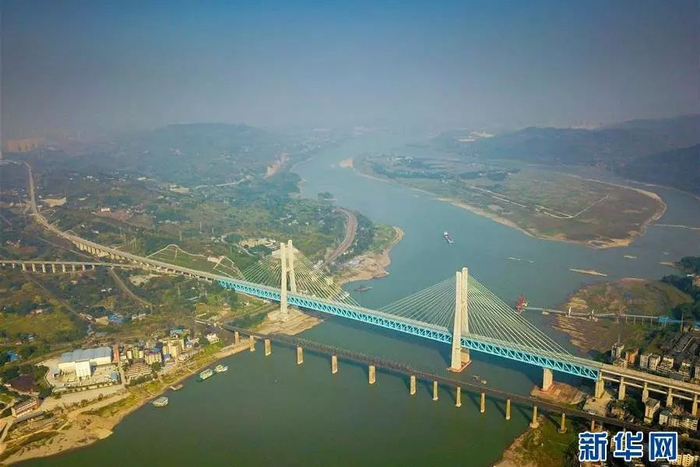 ▶世界首座双层六线钢桁梁铁路斜拉桥——新白沙沱长江特大桥近日在重庆落成,渝贵铁路开通后,列车通过这座大桥最快仅需16.56秒。