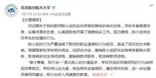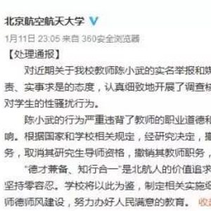 11日晚,北京航空航天大学通过官方微博通报了处理结果:已查明,陈小武存在对学生的性骚扰行为,经研究决定,