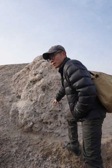 ▲陈凌教授介绍玉奇喀特古城的城墙夯土。摄影:彭茜实地探访过卓尔库特古城,再来到玉奇喀特,更能直观地感受到二者千丝万缕的联系。
