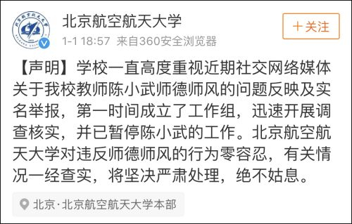 当晚,北京航空航天大学通过官方微博发布声明称,关于教师陈小武师德师风的问题反映及实名举报,学校第一时间成立了工作组,迅速开展调查核实,并已暂停陈小武的工作。