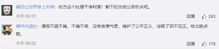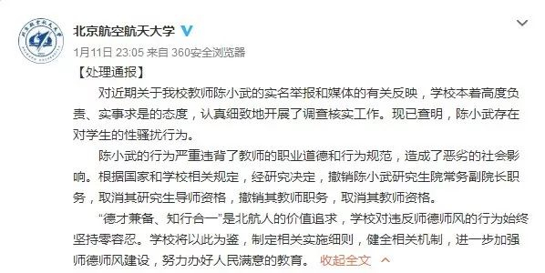 11日晚,北京航空航天大学通过官方微博通报了处理结果: