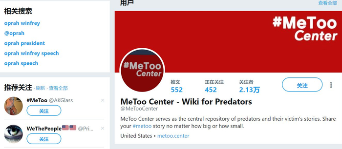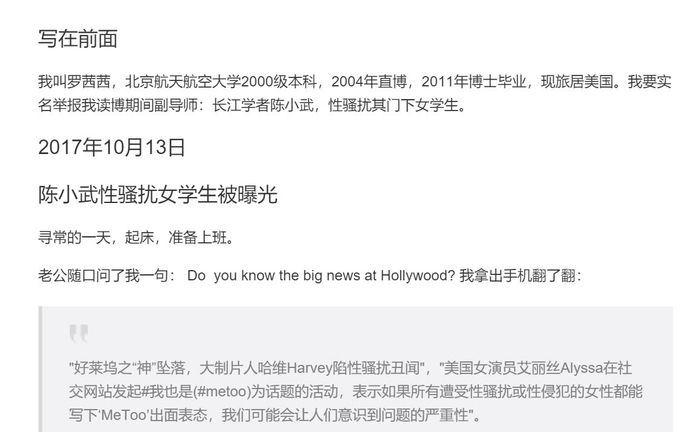 与此形成鲜明对比的是,好莱坞大亨哈维·韦恩斯坦的性骚扰丑闻曝光之后,推特上发起了Me too运动,有上百万人分享曝光了自己遭受的性侵害事实,其中不乏知名人士。实名举报北航陈小武教授的学生罗茜茜也在曝光贴中表示,自己是受到了Me too运动的鼓舞。
