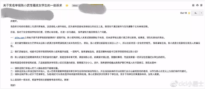 2018年1月1日,罗茜茜博士(微博账号@cici小居士)发表实名举报贴,曝光自己12年前被自己的导师,长江学者陈小武性骚扰的经历。