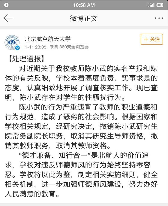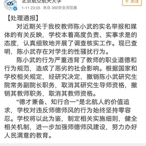 昨晚23点05分,北京航空航天大学官方微博表示,该校教师陈小武已被证实存在对学生的性骚扰行为,其研究生院副院长和教师的职务已被撤销,同时取消其研究生导师和教师资格!