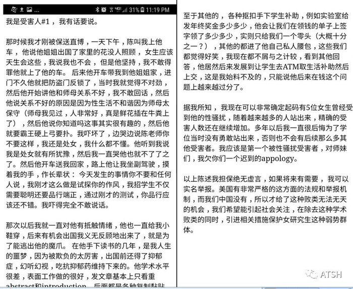 另一位受害人在接受记者专访时称,陈小武存在性骚扰、体罚学生、逼女学生离婚、学术行为不端等行为。