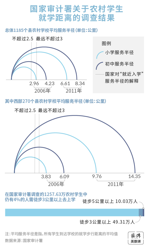 为了检测国家调整义务教育学校布局的效果。2013年,国家审计署发布了《1185个县农村中小学布局调整情况专项审计调查结果》,其中统计了农村地区中小学生上学时间和学校服务半径的变化。调查显示,仍有4%的农村学生,需徒步3公里以上就学;70%的县学校服务半径从2006年到2011年明显增大;所有学校平均服务半径增加了近两公里左右。