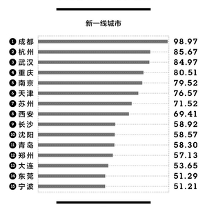 以此综合计算得到的结果是,北上广深4个一线城市的地位依然不可动摇,但15个“新一线”城市的席次有了一些改变,依次是成都、杭州、武汉、重庆、南京、天津、苏州、西安、长沙、沈阳、青岛、郑州、大连、东莞和宁波。