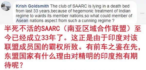 在脸书上,一位尼泊尔网友提醒道:印度参与的SAARC(南亚区域合作联盟,简称“南盟”)至今已经成立33年了,但如今“半死不活”,毫无生气。这正是由于印度对该联盟成员国的霸权所致。