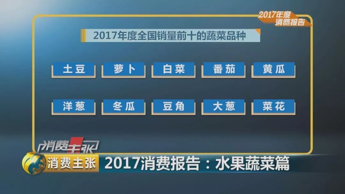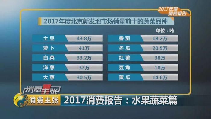 据全国城市农贸中心联合会统计的数据显示,2017年,全国销量前十的蔬菜品种为:土豆、萝卜、白菜、番茄、黄瓜、洋葱、冬瓜、豆角、大葱、菜花。