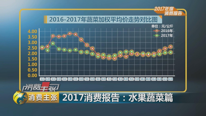 北京新发地市场统计部 部长 刘通 :2017年和往年有些不太一样的,有几个季节出现了价格比较反常的现象,2017年三、四月份价格,比2016年同期下降了30%、40%,这个降幅非常明显,2017年夏季比2016年同期,相对来说就高出一截来,但是2017年到了冬季的时候,这个价格也有些反常,因为每年从新发地市场来看,从11月份开始一直到2月份,这个价格是一直走高的,上涨幅度比较大,基本上加强平均价,能够从2元钱一公斤上涨到3.5元一公斤,就是价格上涨了70%、80%,但是2017年11月份、12月份,这两个月价格上涨幅度只有百分之十几,不到20%,这个价格上涨幅度比2016年同期相对来说就小很多。