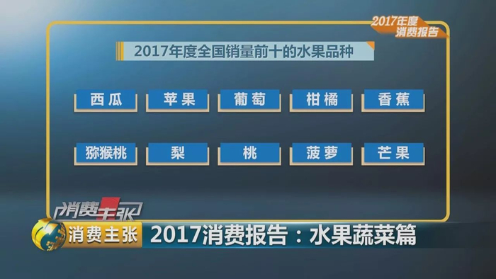 据全国城市农贸中心联合会统计的数据显示,2017年度销量前十的水果品种为:西瓜、苹果、葡萄、柑橘、香蕉、猕猴桃、梨、桃、菠萝、芒果。
