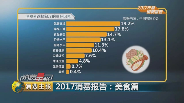中国烹饪协会发布的《2017年度美食消费报告》显示,这一年,消费者在选择餐厅时,最关注的因素排在首位的是就餐环境,占19.2%,其次是菜品口味,占17.8%,不断追求优质的消费体验和消费环境。食品安全因素排在第三位,占14.7%,仍是备受关注的热点话题。价格因素仅列在第四位。