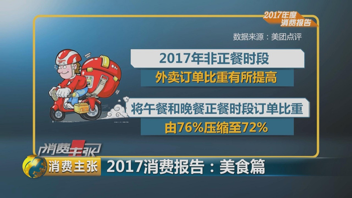 中国烹饪协会发布的《2017年度美食消费报告》显示,2017年非正餐时段外卖订单比重有所提高。将午餐和晚餐正餐时段的订单比重由76%压缩至72%。
