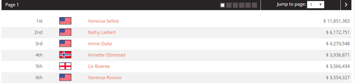 ▲在thehendonmob网站的排行榜上,Selbst以近1190万美元的累计奖金位列女牌手首位(数据截至2018年1月11日)