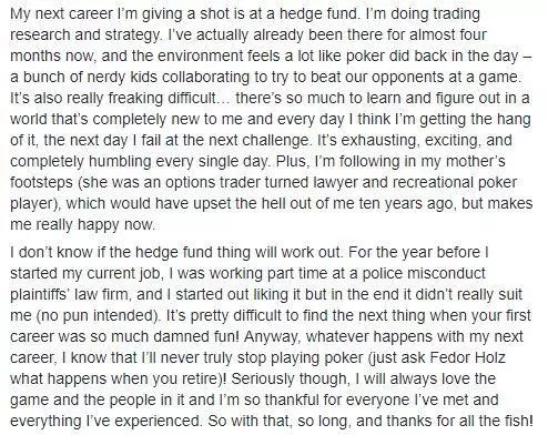 据彭博报道,尽管双方都未正面回应这一消息,但去年12月31日,Selbst在Facebook上发表的长文中透露,“四个月前我开始做一些交易研究和策略研究,大环境总体上来说有点类似于之前打扑克时的环境,每天的生活很疲惫但也很兴奋。另外,我正在跟随母亲的足迹(妈妈此前就是一名期权交易员,后来转做了律师,平时也是一个业余的扑克玩家)。”