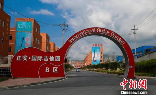 走进正安国际吉他园,一眼就可以看到一把斜立在屋顶的巨型黄色吉他,旁边的“中国吉他制造之乡”8个大字惹人注目。还未入园,耳边就响起吉他工厂机器作业发出的声音。