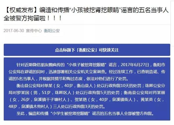 网络又现“衡阳县两学生被挖肾挖眼”谣言,警方将严查造谣者