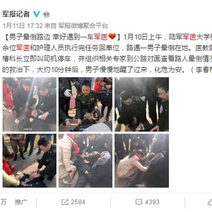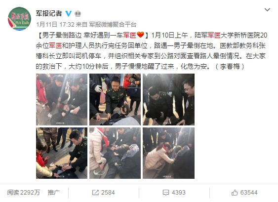 1月10日上午11时左右,陆军军医大学新桥医院20余位军医和护理人员在执行完任务回单位,所行车辆行至重庆市沙坪坝区凤鸣山到上桥(金色悦城)路口处时,车上人员看到公路对面的一男子晕倒在地,医教部教务科张椿科长立即叫司机停车。