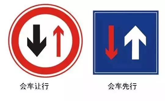 会车让行:表示车辆会车时,必须停车让对方车先行。注意“必须停车”这四个字。此时,红色箭头行驶方向的车辆要停车让行,黑色行驶箭头方向车辆要先行。