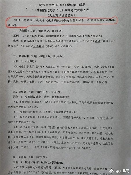 有趣!武大“奇葩”考试 学生要“自己出题考自己”12日,武汉大学《中国古代文学》课的考试要求,学生需自己出题并作答,同时,出题不能过于简单,考试分数会酌情考虑题目难度系数。授课老师说,“这种方式既给了学生自由度,又考验了基本功。”