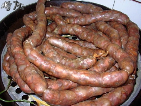 把晾好的肠放在锅里蒸30分钟左右,好后拿出挂晾,喜欢吃干点的,可以多晾几天