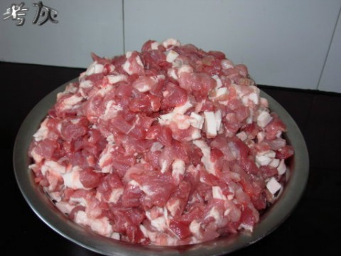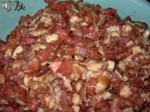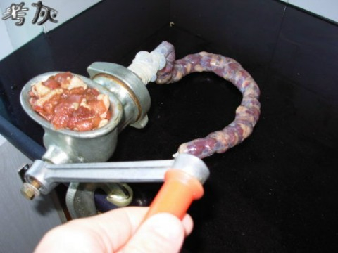 把腌制好的肉放入绞刀内,慢慢摇动手柄