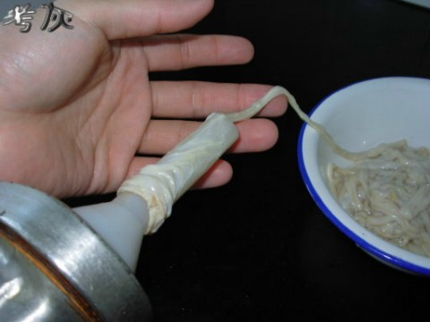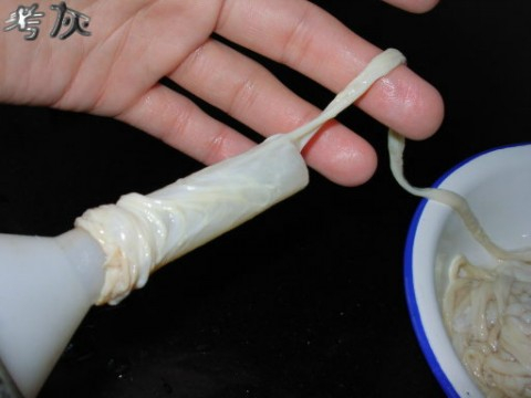 之后把整根的肠衣套在漏斗上,尽头打个结