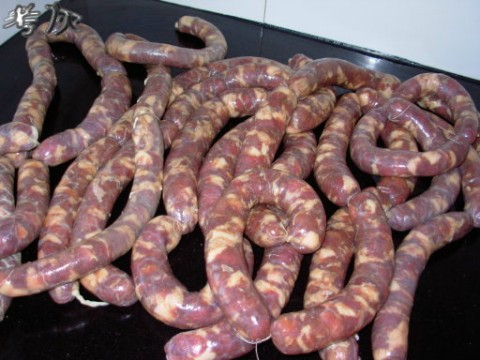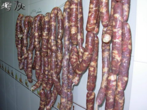 之后把灌好的肠挂起来,风干4到5天左右(肠衣表皮干燥状)
