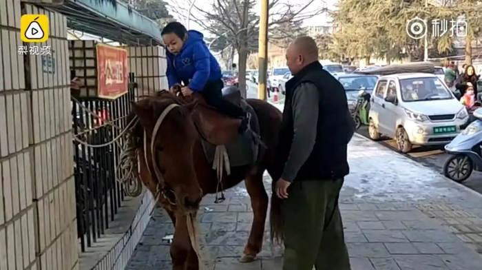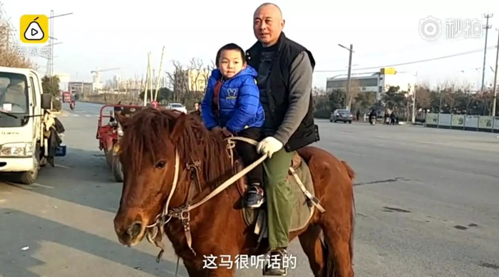 小男孩表示,骑马不害怕。父亲说,骑马回家大概十几分钟,在路上会遵守好交通规则,马很听话。你小时候幻想过骑马上学吗?