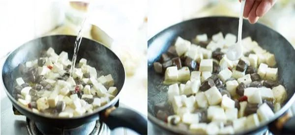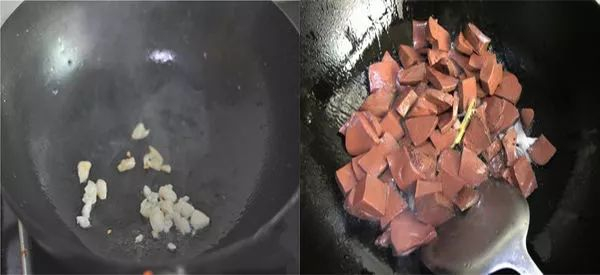 起油锅,先放入姜葱爆香,再下豆腐和猪血,翻炒一会儿,然后倒入料酒,再翻炒几下。