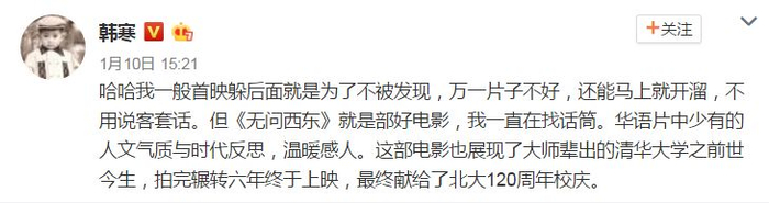 “《无问西东》是一部勇气之作,一部好电影。尤为可贵的是,并不止步于鞭挞社会的扭曲和人性卑劣,恰恰用时代的悲凉更为衬托起人性中因着对崇高和善的执着坚守而绽放的璀璨光芒。”——电影导演陆川