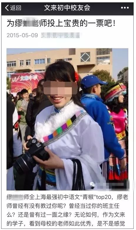 随着事件的发酵,当事患者也被“人肉”出来,系上海市闵行区知名学校——文来中学的缪姓女教师,曾参选2015年度“上海市语文教学之星”。