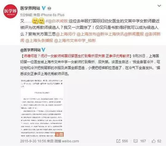 2015年9月26日,上海国际和平妇幼保健院的一位医生被上海市文来中学一女教师打到骨折、尿失禁。《医学界》官方微博当时亦发布相关消息,并被转载500多次,引起医疗界人士广泛关注。