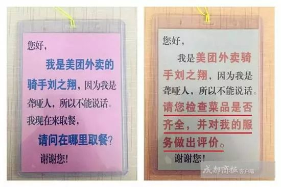 原来,点餐客人所说的“残疾证”,其实是刘之翔的工作牌,因为聋哑,刘之翔没有办法向其他人一样和客户交流,公司便为他专门制作了工作牌,一面是询问取餐地点、一面是请客户给予评价的文字。