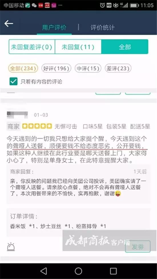 这让点餐的客户格外愤怒,在点餐平台上狠狠地给了差评,随后,商家在评论下回复称,已向公司投诉,并表示,“绝对不会再有聋哑人送餐了。”