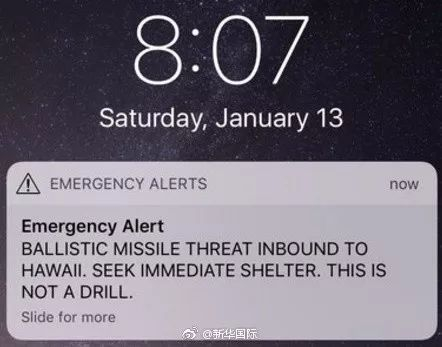 当地时间13日,美国夏威夷不少民众收到一条手机警报,内容为“弹道导弹进逼夏威夷,立即寻求庇护,这不是演习”。20分钟后,夏威夷州官方发文澄清,“人为错误”。当地政府已对此事展开调查。