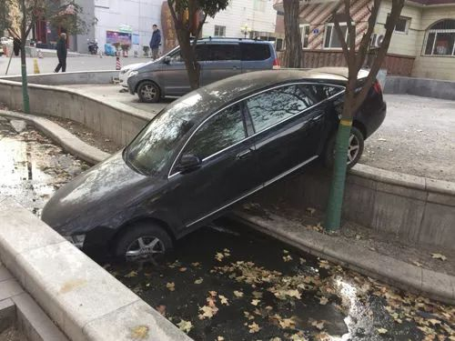 1月14日早上8点多,在济南市文化西路体育嘉苑北门附近,一辆黑色轿车在倒车时,疑似由于司机挂错档位,车一下子扎进路边一水池中,所幸的是司机并无大碍。