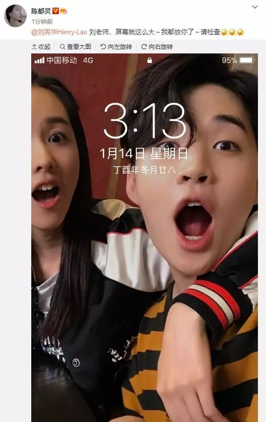 1月14日因为出演苏有朋执导的电影《左耳》而走红的陈都灵在微博晒出一张手机屏保疑似公布与SJ成员刘宪华的恋情,她在微博当中写到:刘老师,屏幕就这么大~我都放你了~请检查。