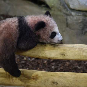 当天一大早,"圆梦"在妈妈"欢欢"的带领下,来到熊猫馆室内活动区,"欢欢"悠闲进食早餐时,它在一旁不停攀上爬下,十分活泼。 活动区里的木头栏杆和岩石都成了它练习攀爬的道具,只不过一不小心没抓牢,还是会像一团毛球一样滚下来,逗得围观的人们捧腹大笑。