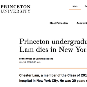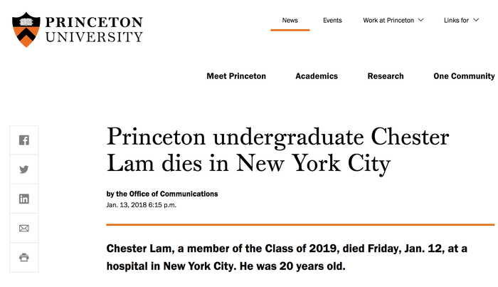 中新网1月15日电 据美国中文网报道,根据美国普林斯顿(Princeton)大学的校网公告,一名20岁的华裔大三学生切斯特·林(Chester Lam,音译),于当地时间1月12日在纽约市某家医院自杀身亡。他在普林斯顿大学主修计算机科学,在医院自杀那日正临近学校全专业本科生上交作业最后期限。