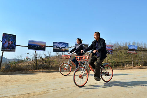图为山西省永和县奇奇里村“第一书记”郭若桥骑着共享单车经过村里的摄影展板(10月27日)。摄影记者/曹阳