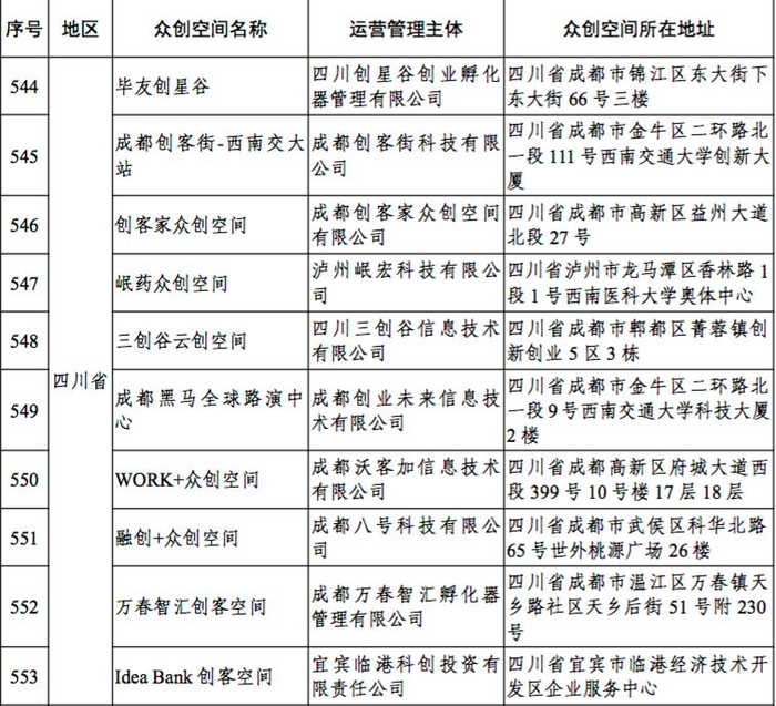 2017年度国家备案众创空间名单: