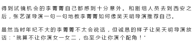 在李菁菁上初二时,偶然发现了《老井》电影剧组招聘演员的广告,踩着一双回力球鞋穿着破运动裤就去了。