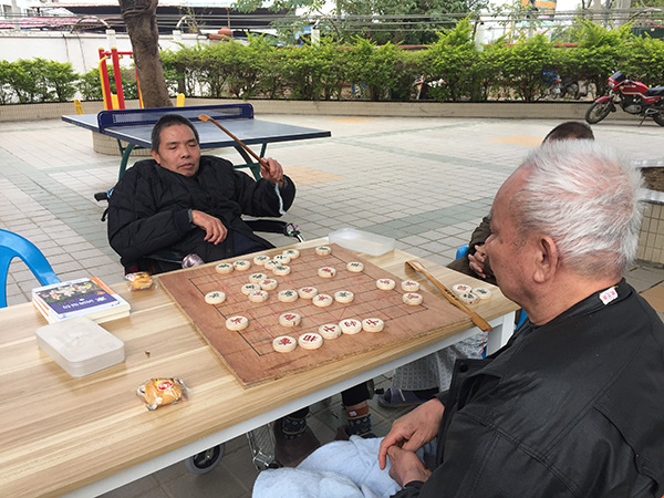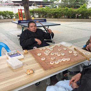 这是一场特殊的棋局,对弈双方均坐在轮椅上,各自拿一把痒痒挠挪动棋子,这个情景发生在广东云浮市郁南县社会福利中心(以下简称“福利中心”)。